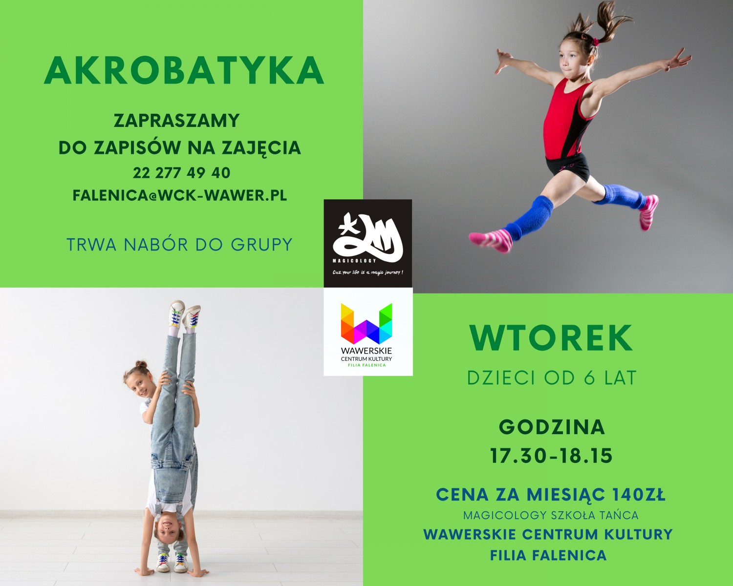 AKROBATYKA / WTOREK / DZIECI OD 6 LATWtorek: 17.30 - 18.15Instruktor: Magicology szkoła tańca
